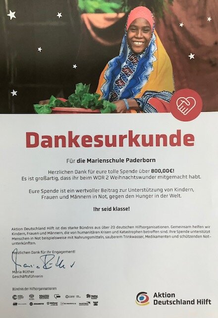 Auch die Marienschule ließ sich die Chance nicht entgehen, am Weihnachtswunder des WDR 2 teilzunehmen. So ging der gesamte Erlös des jährlich stattfindenden Adventsbasars an die Aktion Deutschland Hilft.
