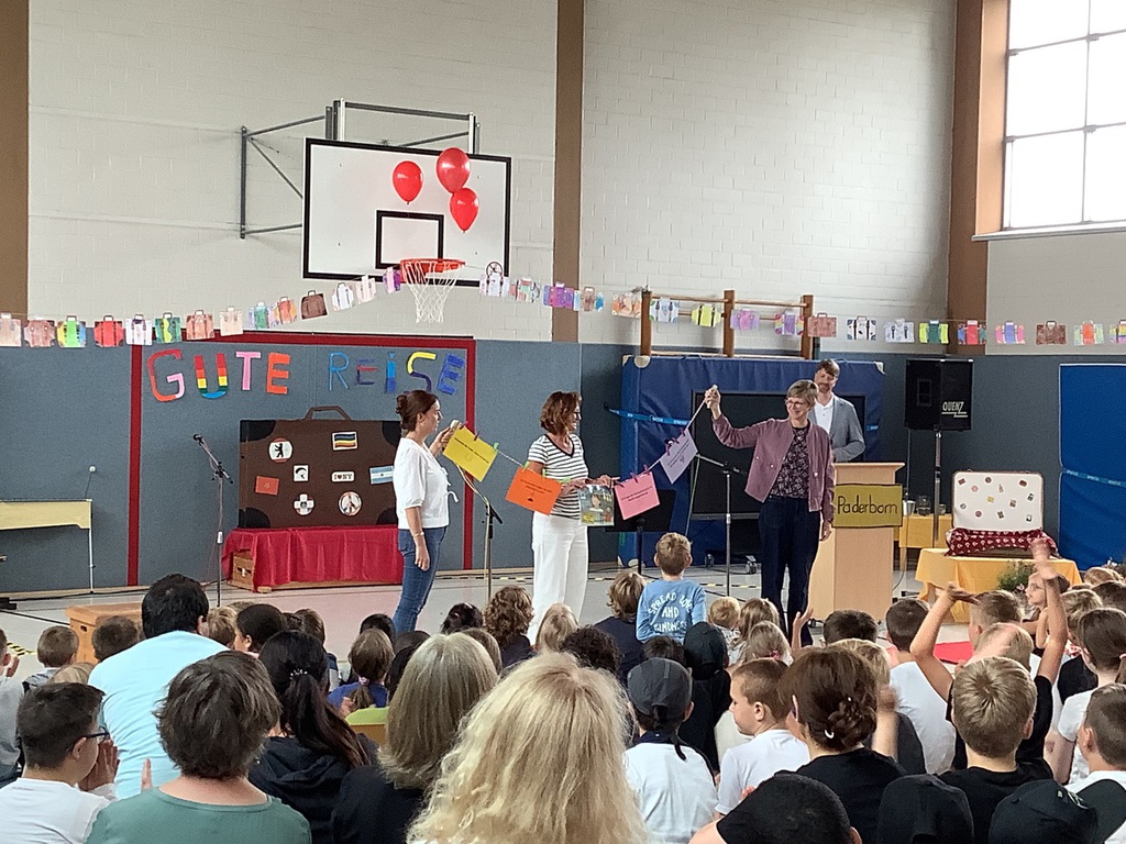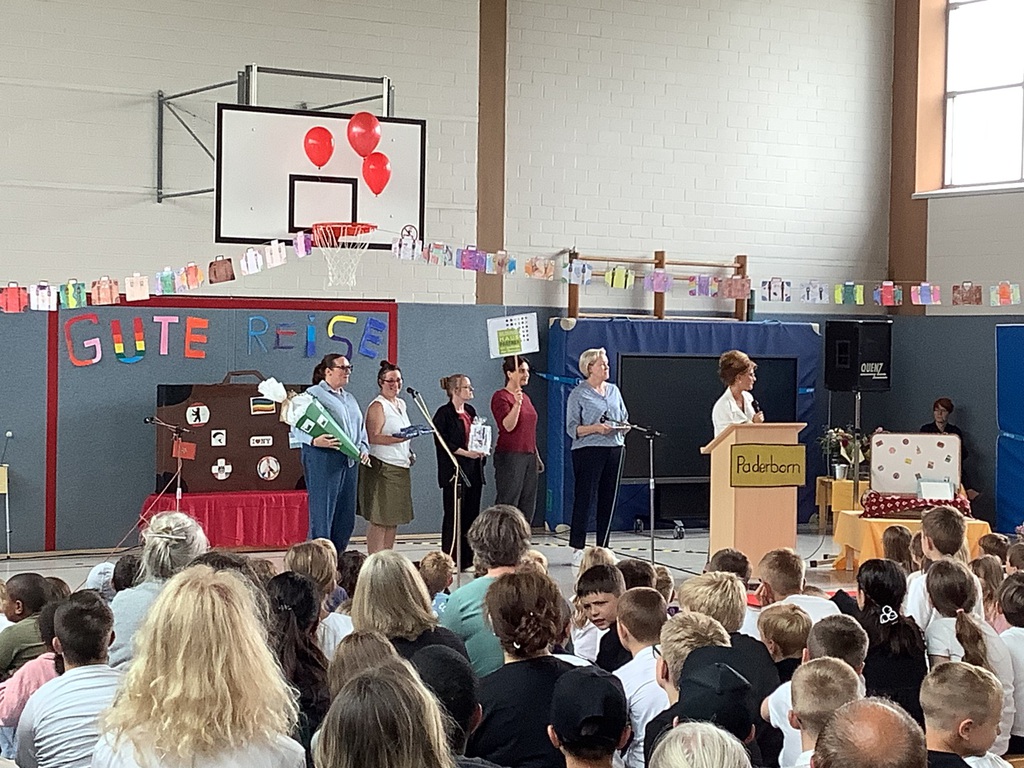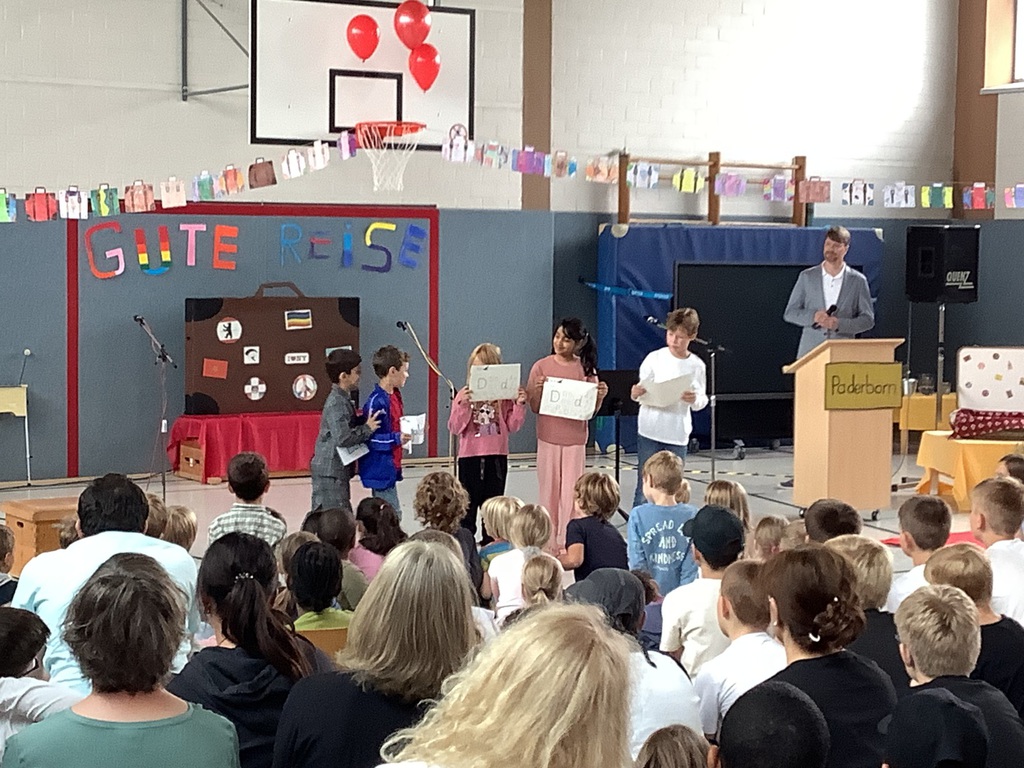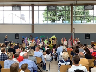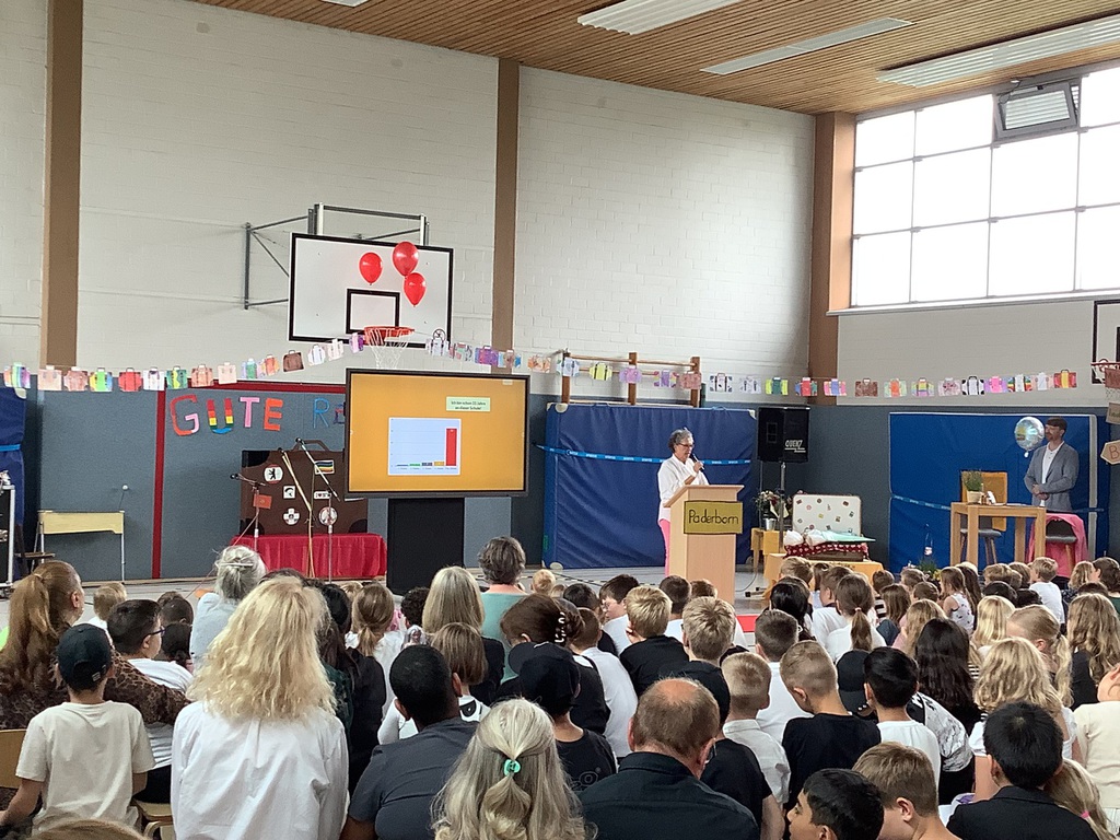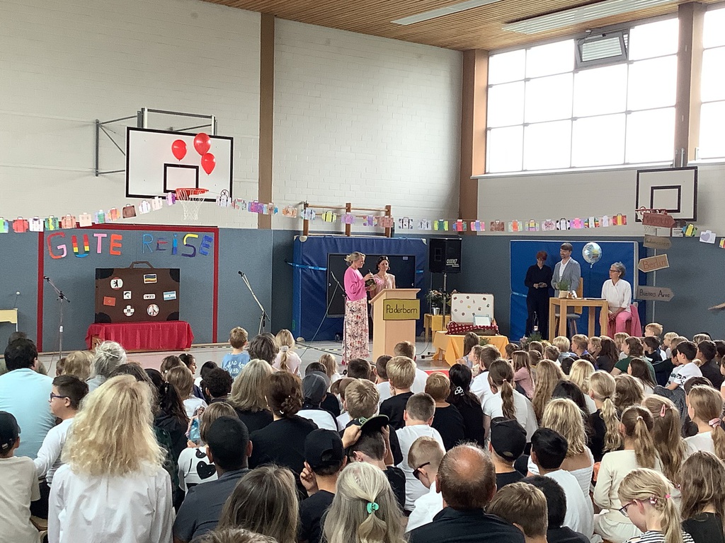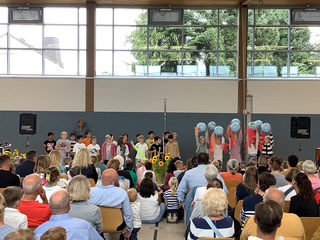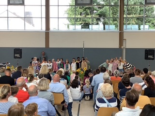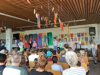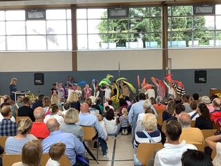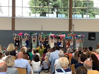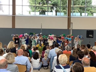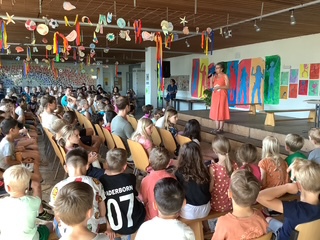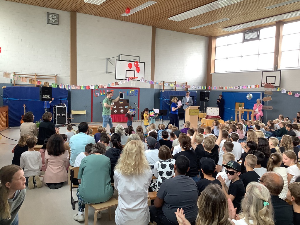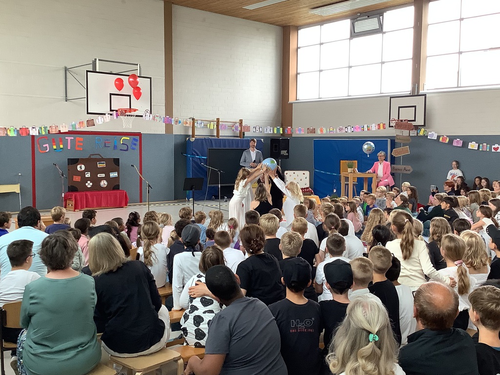 Am 2. Juli verwandelte sich die Aula der Grundschule in eine bunte Musicalbühne: Die Schüler/innen der Klassen 1 führten das Stück „Die Neue in der Klasse“ auf – ein selbstgeschriebenes Musical, das nicht nur mit eingängigen Liedern, sondern auch mit einer berührenden Botschaft überzeugte.
