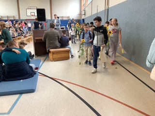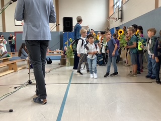 Mit Musik, einem Schultütentanz und einer Sonnenblume, überreicht von den zukünftigen Patenklassen, wurden die Kinder gebührend in Empfang genommen.