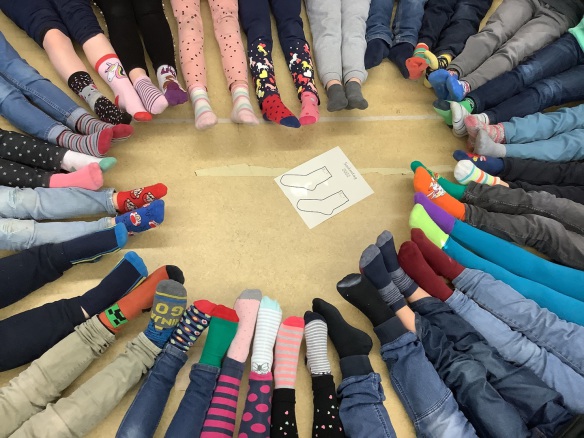 Anderssein hat an der Marienschule Raum - jedes Kind findet seinen Platz. Darum machen wir uns auf die Socken, um allen zu zeigen, dass Unterschiede uns bereichern. Wir zeigen es mit kunterbunt angezogenen Füßen. Geringelt mit geblümt, knallig bunt mit kreideweiß, kurzer Socken mit langem Strumpf.
