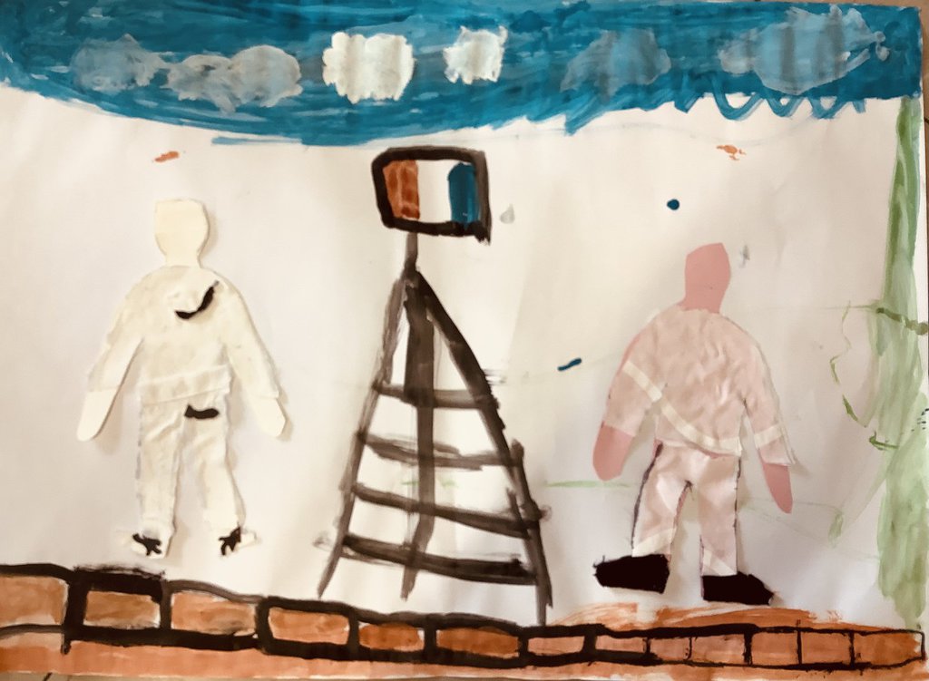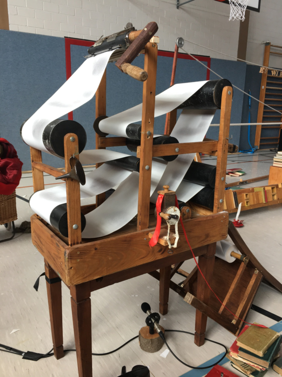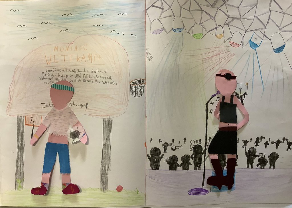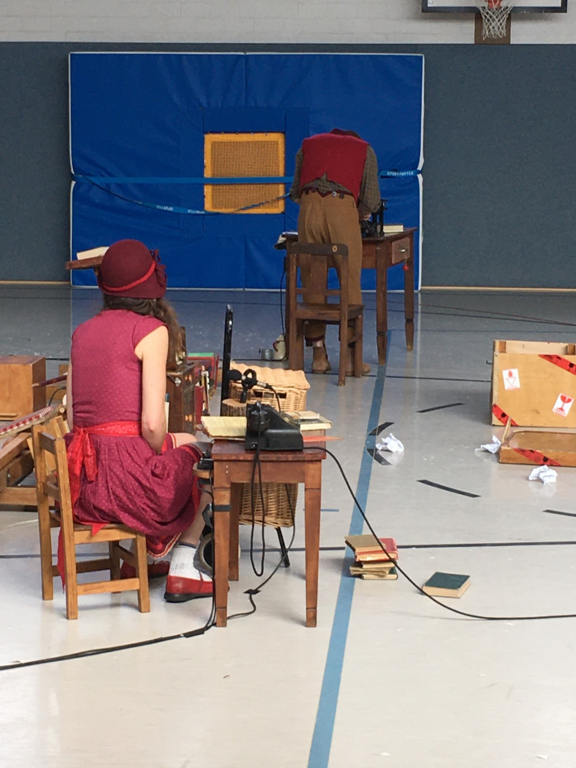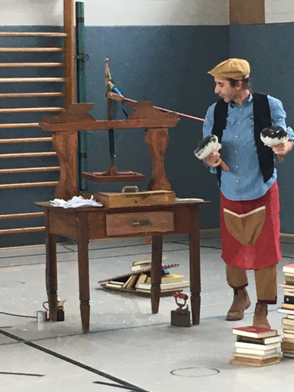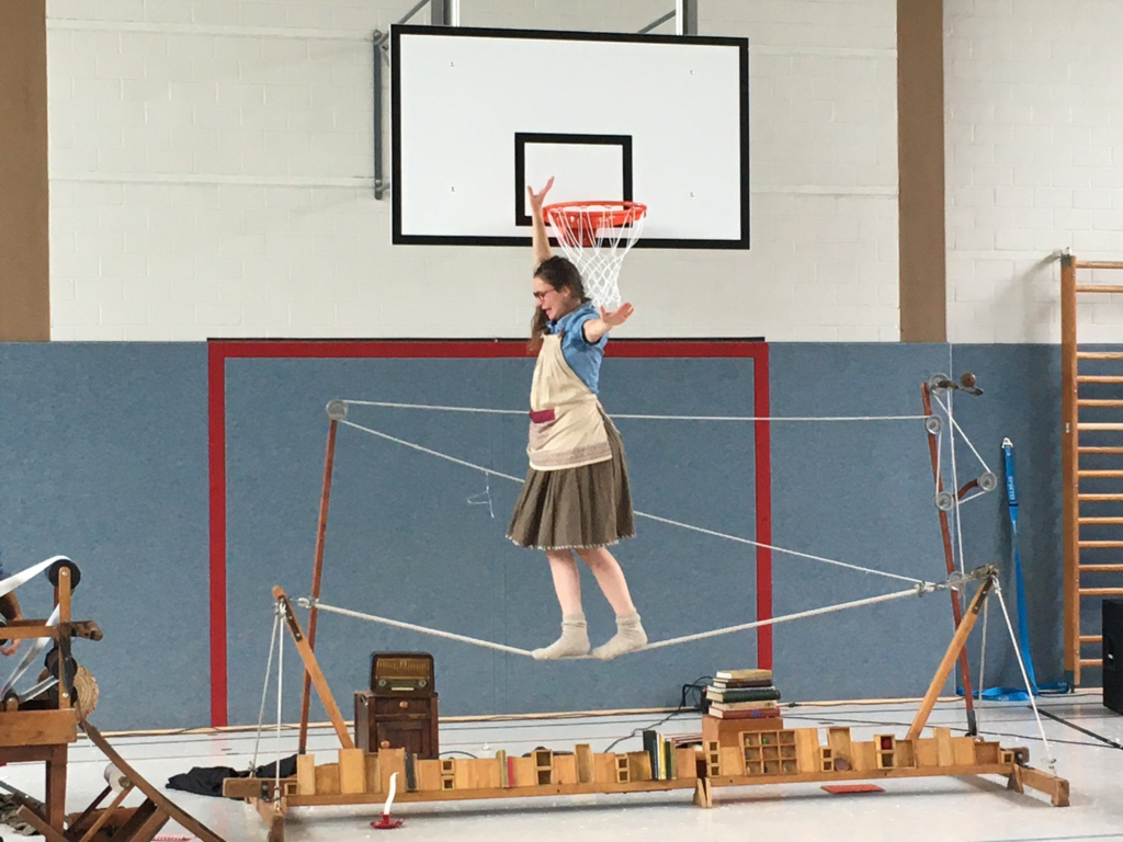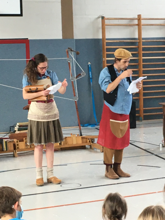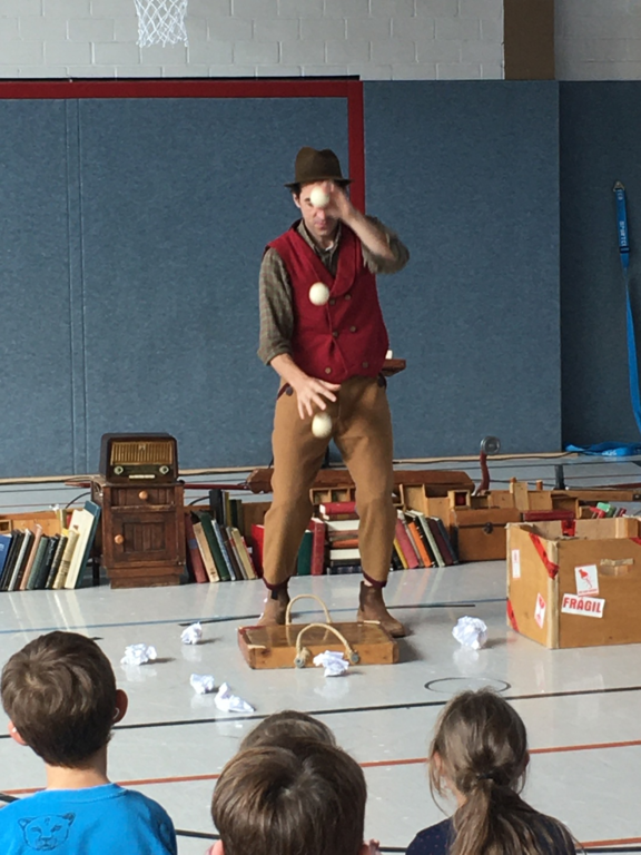 Zu Beginn des Theaterstücks klingelte ein Telefon. Währenddessen suchte eine Frau eine Antenne. Danach kam ein Mann dazu. Er hatte ganz viele Ideen, deshalb konnte er nicht schlafen. Er begann seine Ideen auf ein Blatt Papier zu schreiben. Anschließend knüllte er das Blatt Papier zusammen und schmiss es weg. Dies wiederholte sich einige Male. Dann klingelte das Telefon. Ein Paket war angekommen. In dem Paket befand sich eine Schreibmaschine. Jetzt schrieb der Mann auf der Schreibmaschine weiter und warf das Papier wieder weg. Danach jonglierte er mit Bällen. Nun packte er die Papierknollen in eine Tasche und ging zur Buchdruckerei. Dort spannten sie eine Papierrolle ein und pressten das Papier zu einem Buch zusammen. Zum Schluss warfen beide Schauspieler mit Konfetti.