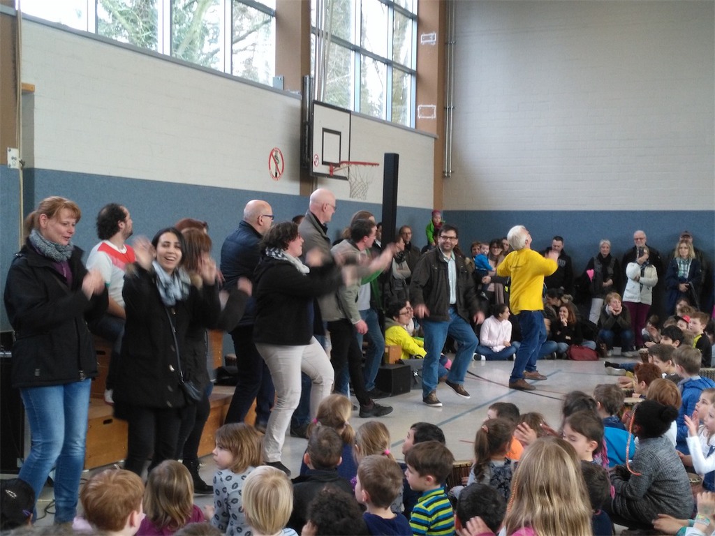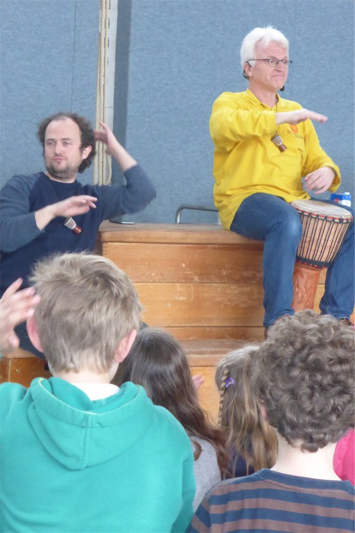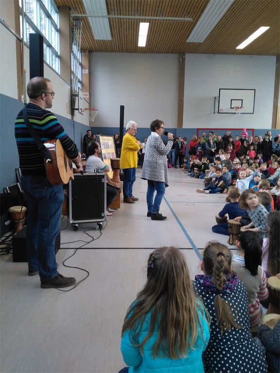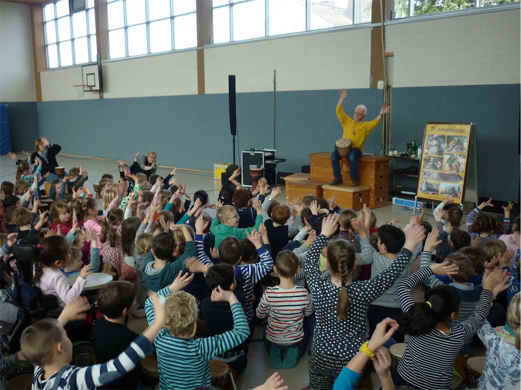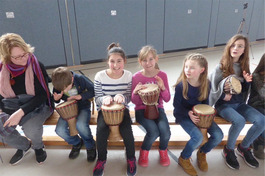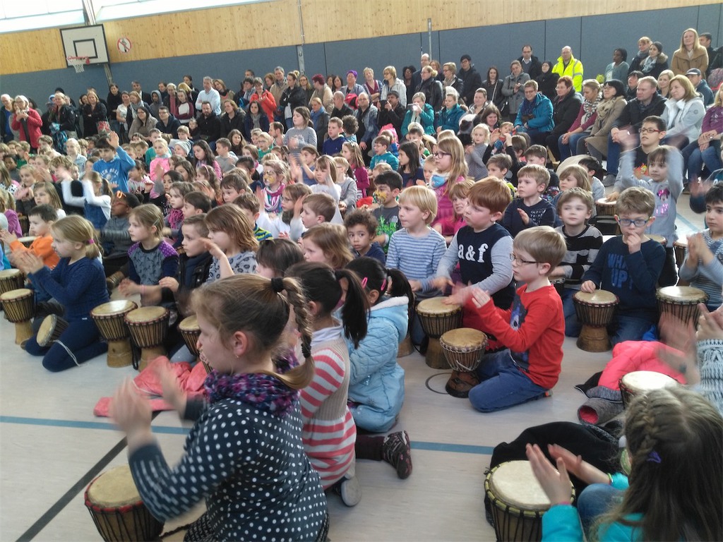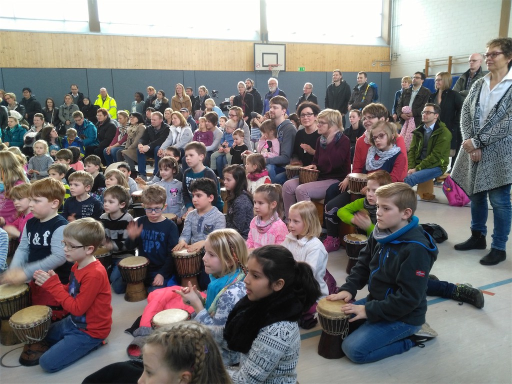 Den Höhepunkt der Themenwoche bildete der Trommelworkshop und das Abschlusskonzert am Freitag Nachmittag, zu dem auch die zukünftigen Schulkinder aus den Kindertagesstätten eingeladen waren. In der Klasse 4a entstand die Idee Spenden für notleidende Menschen in Ostafrika zu sammeln. Am Ende des Konzerts kamen so 371,90€ zusammen. Allen Spenderinnen und Spendern ein herzliches Dankeschön dafür!